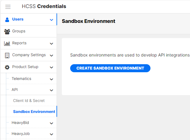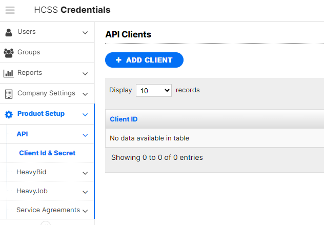 You can generate API clients by going to HCSS Credentials and selecting Product Setup/API/Client Id & Secret.